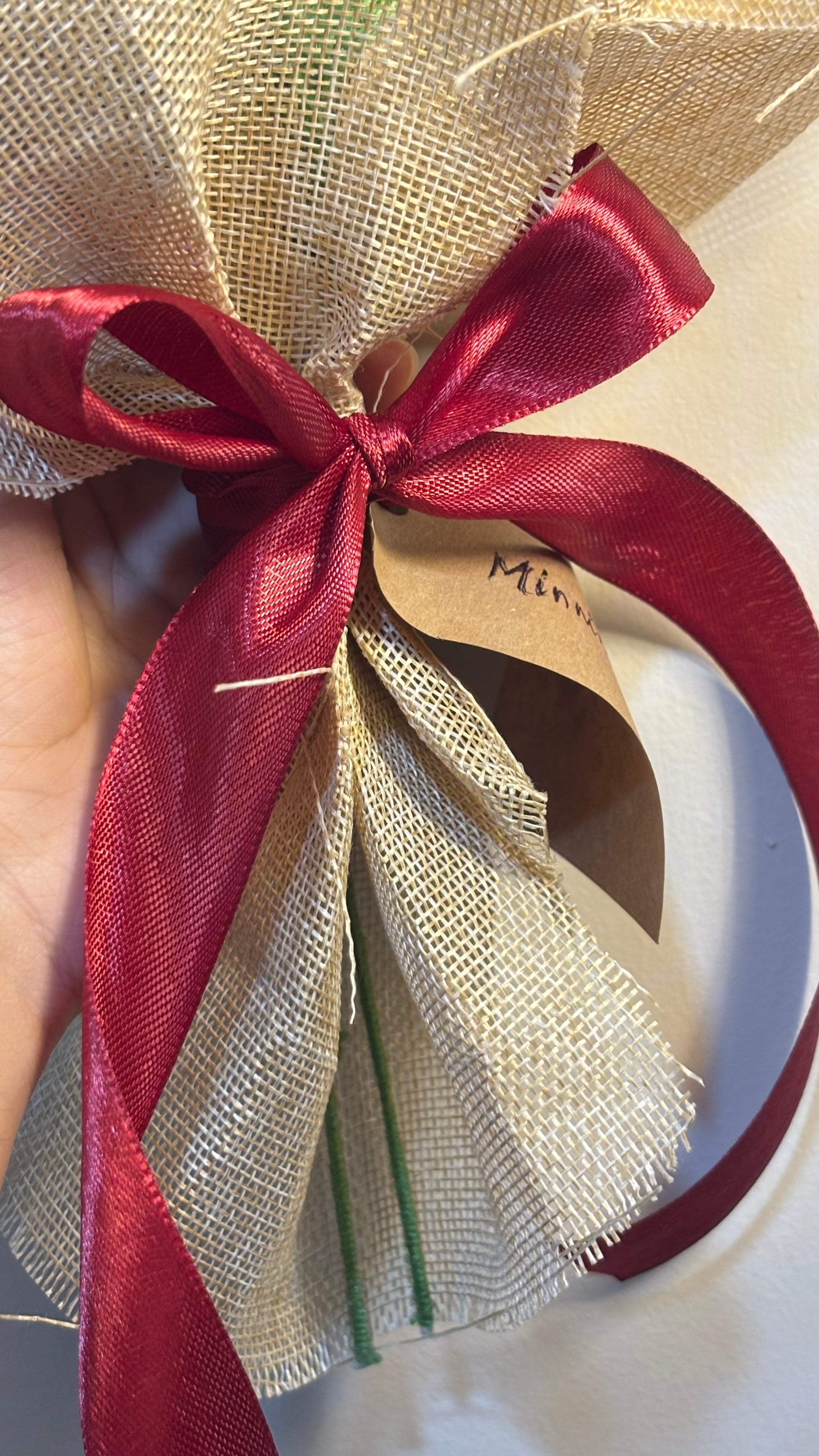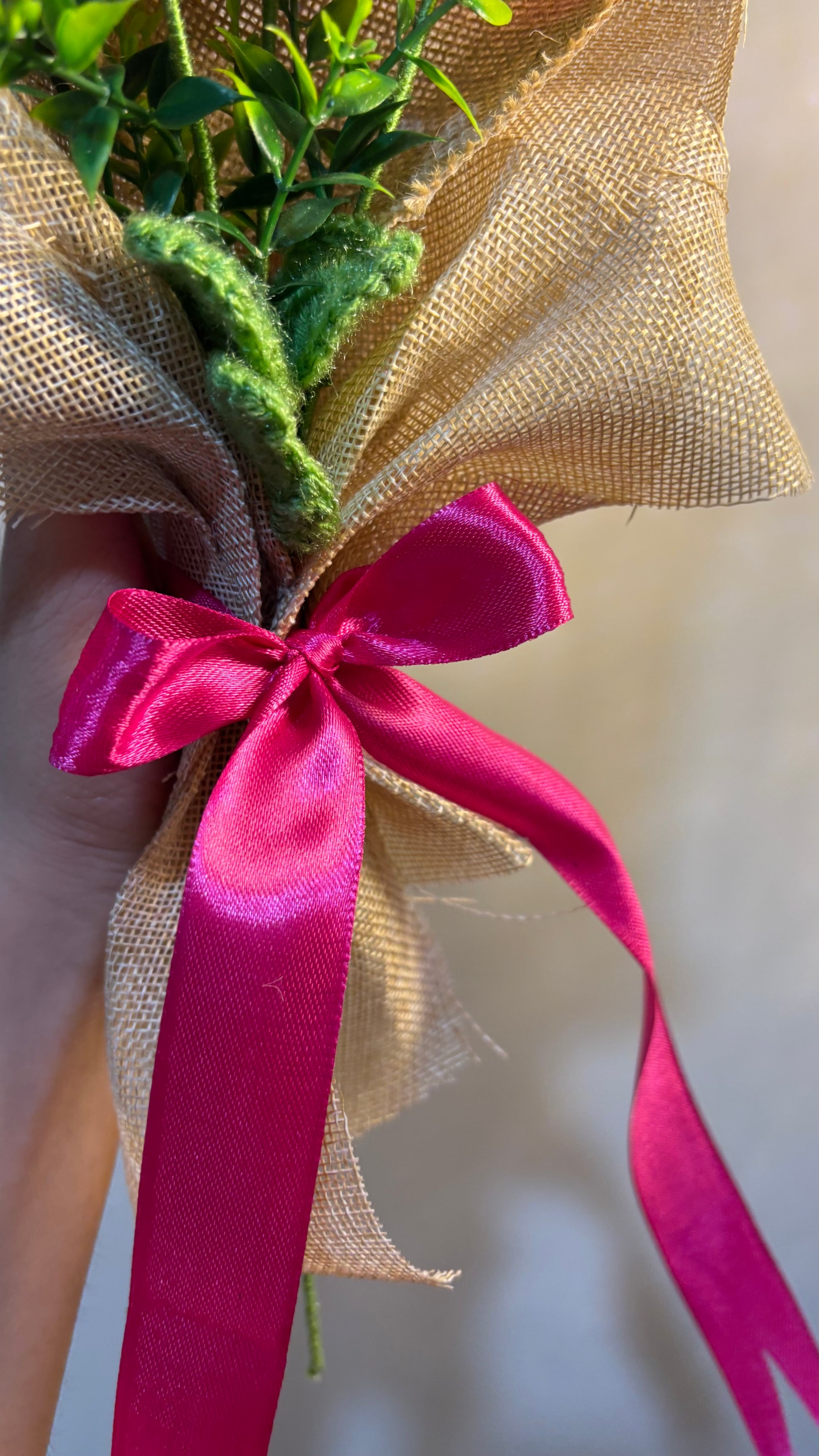 Delicate and charming, this handcrafted crochet bouquet features three beautifully detailed pink peony blossoms, wrapped in rustic burlap and tied with a vibrant pink satin ribbon. The soft woolen texture combined with lush green leaves and sprigs creates a perfect gift for birthdays, anniversaries, or just to brighten someone’s day. A timeless floral keepsake that never wilts.