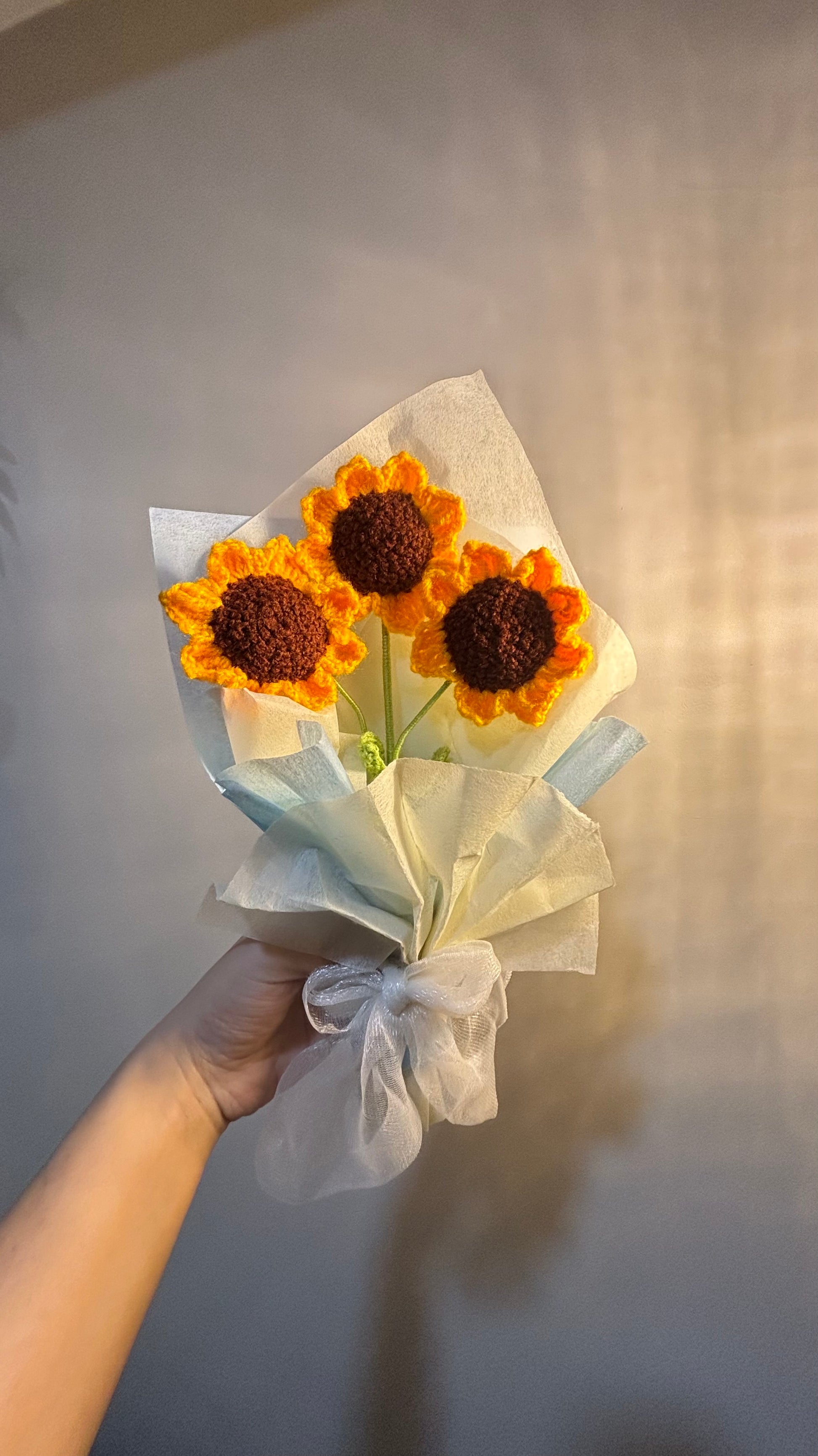 Brighten someone’s day with this handcrafted crocheted sunflower bouquet. 🌻 Made with love and precision, each sunflower features rich brown centers and vibrant yellow petals, wrapped in soft pastel paper and finished with a delicate net bow. A perfect long-lasting alternative to fresh flowers — ideal for birthdays, anniversaries, home décor, or just because.