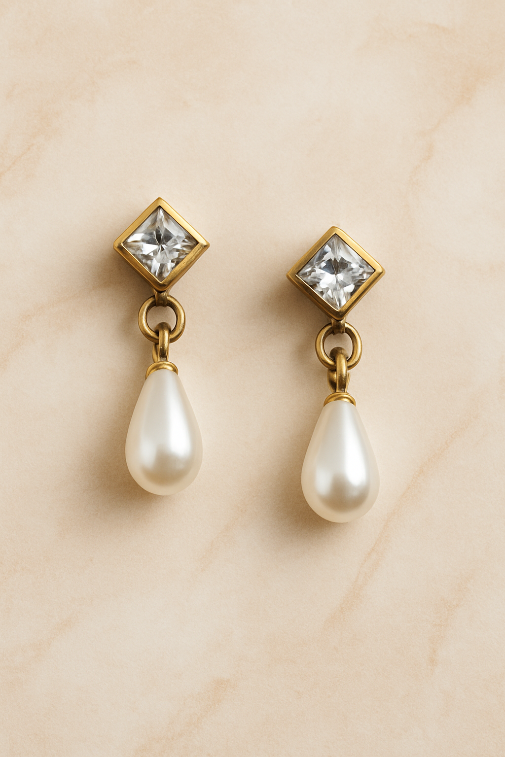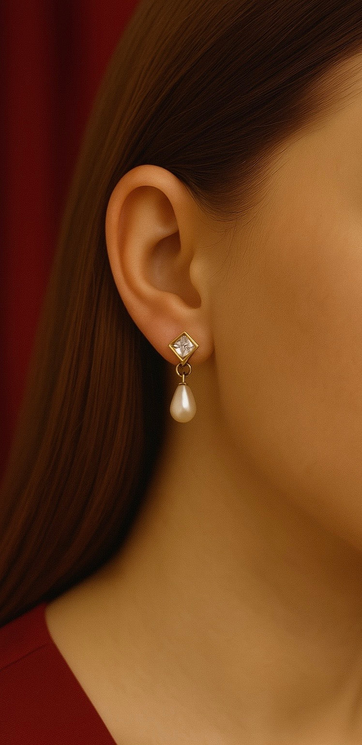 Elegant and timeless, these dangler earrings feature a square-cut crystal stud with a glossy dewdrop charm suspended below. The soft sheen of the drop paired with the sparkle of the stone makes them perfect for formal wear, weddings, or evening outings.