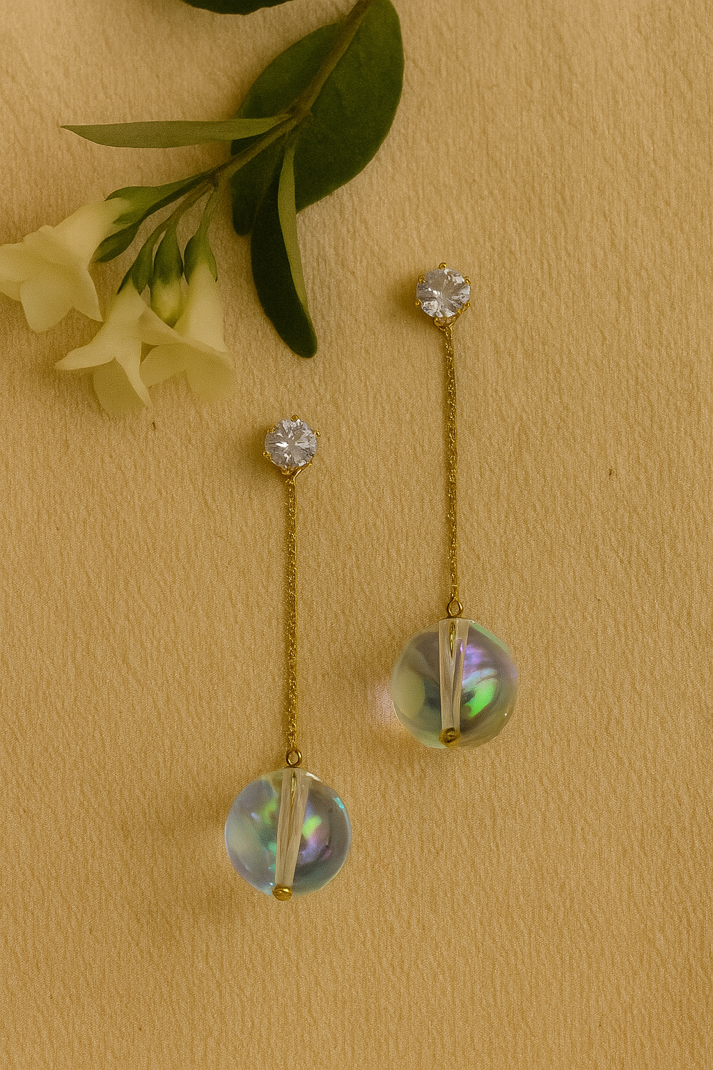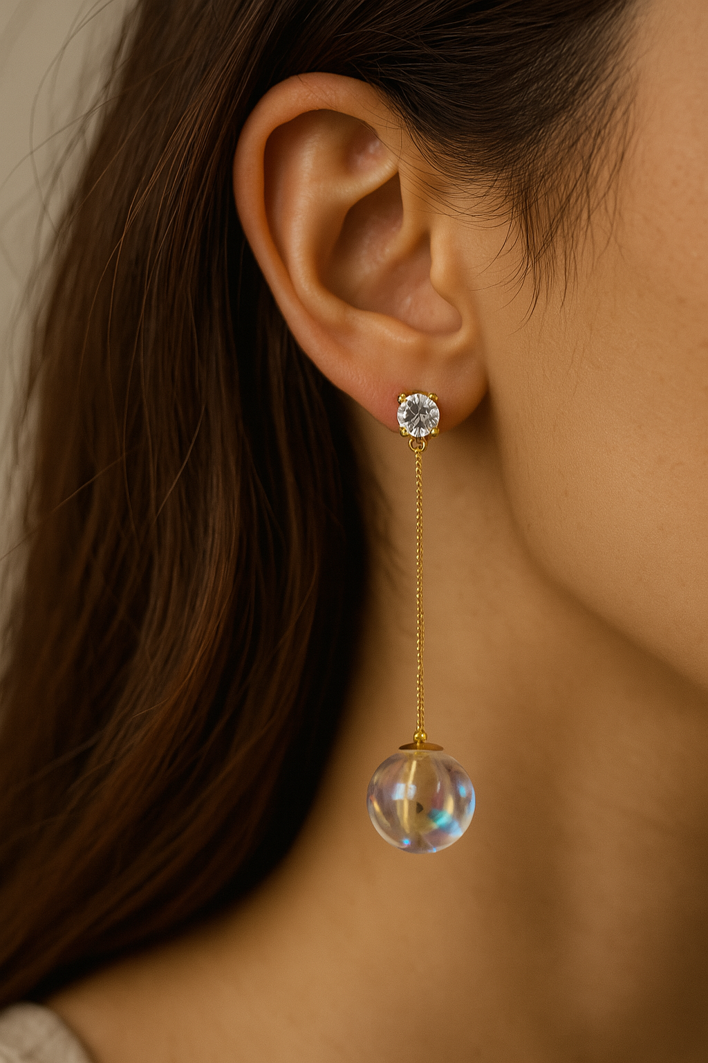 Elegant and ethereal, these Crystal Drop Illusion Earrings feature a delicate gold-toned chain anchored by a luminous transparent orb that subtly reflects light with a rainbow sheen. The sparkling stone stud adds a touch of brilliance, making these earrings perfect for both everyday elegance and special occasions. Lightweight and enchanting, they bring a dreamy finish to any outfit.