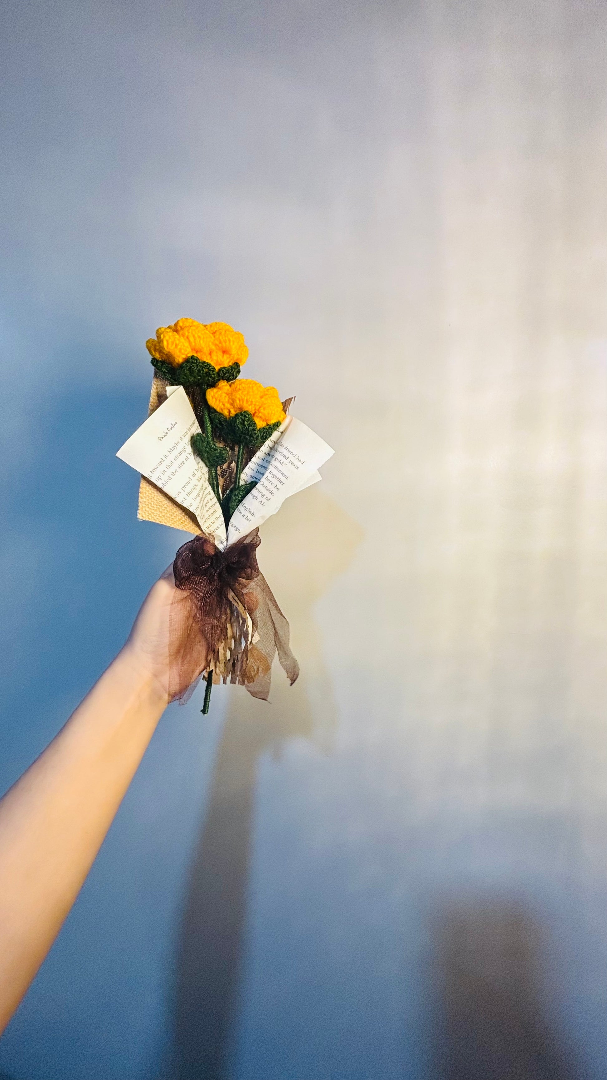A radiant bouquet featuring two handmade yellow crochet roses symbolizing joy, positivity, and new beginnings. Wrapped in rustic jute with vintage paper accents and a soft brown net bow, this charming bundle makes the perfect sunshine-filled gesture for someone you care about. Everlasting and elegant — no watering, just warmth.